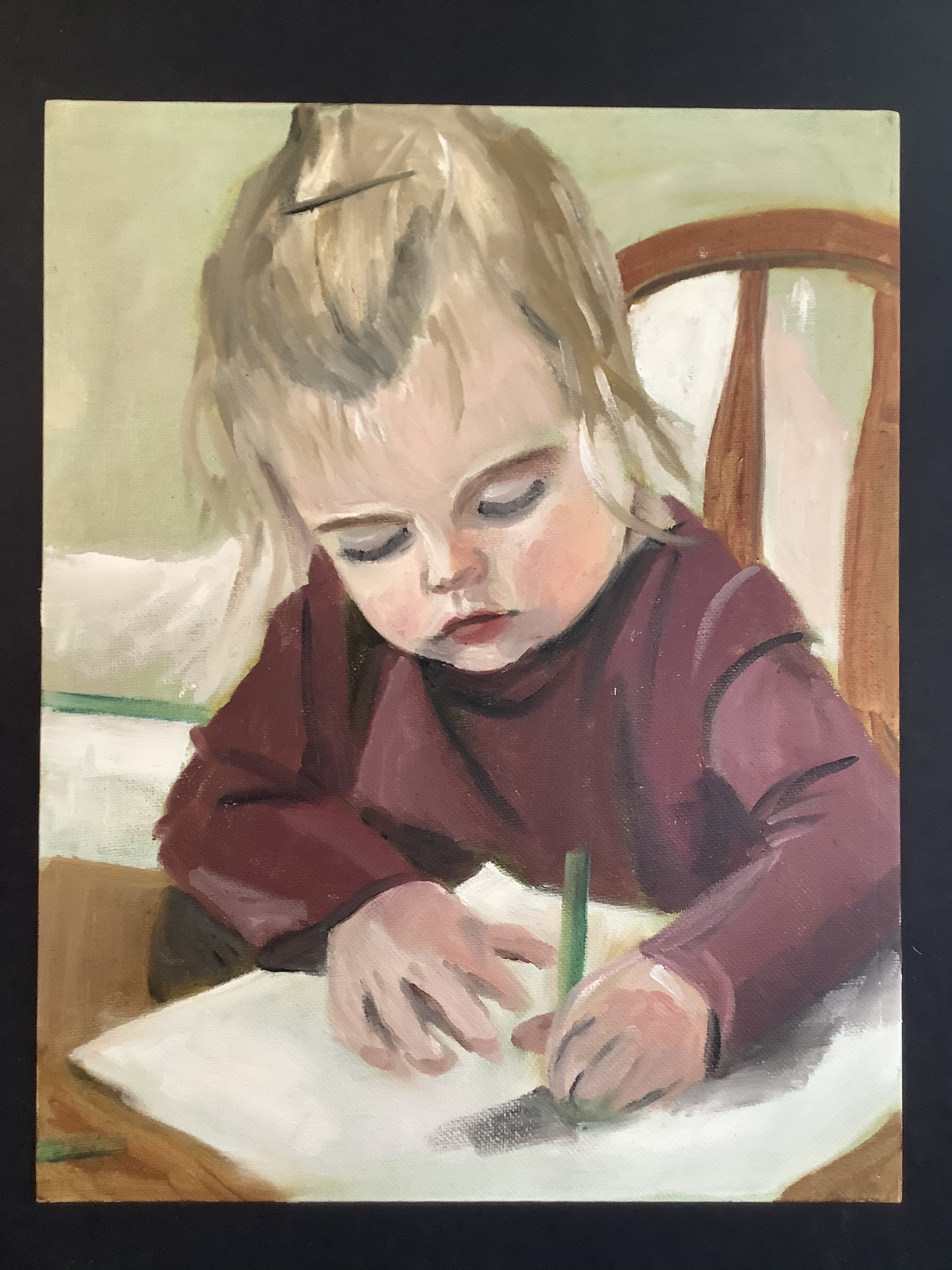My daughter-in-law suggested that I paint something for my son’s birthday and sent me a photo of their youngest daughter to work from. I thought it was a lovely expression, a fun pose and a great background. It came together really well and the result makes us all smile.