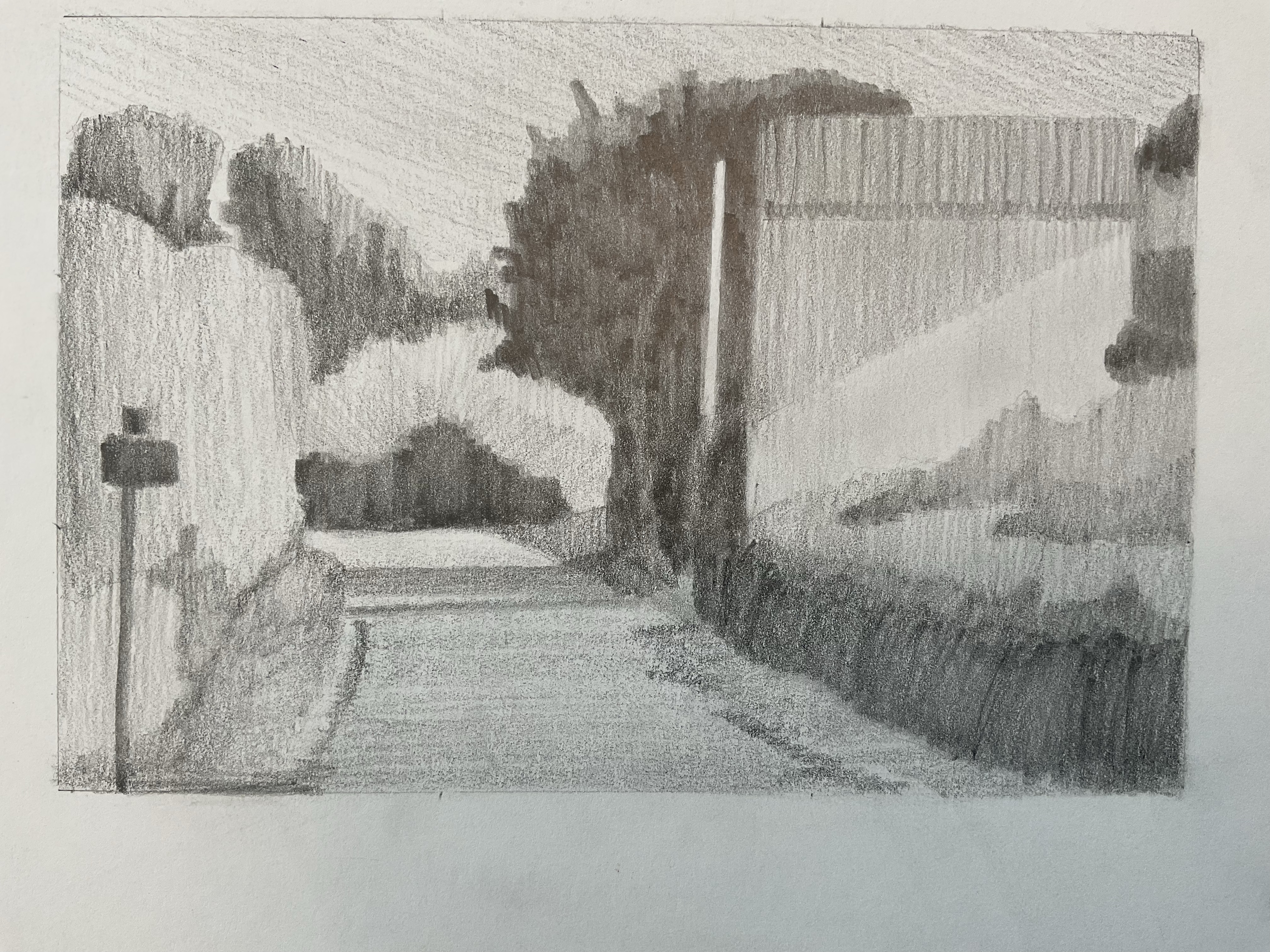 Below is my sketchbook showing this process, and indicating the value pattern I chose. But then I didn’t keep exactly to it, and I used strange colors, so I was not entirely happy with the painting above. I have since practiced quite a bit more and have some better results—in future posts!