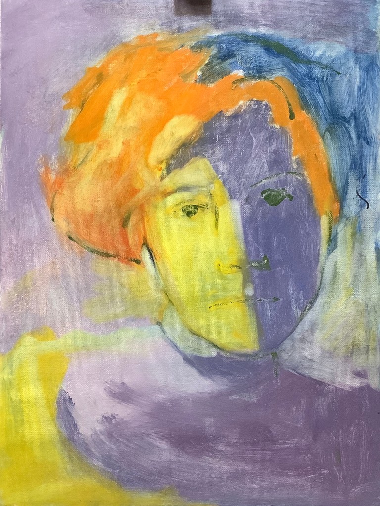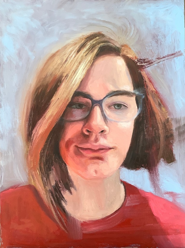 This is from a selfie photo, but not of me! As I was looking through the photos on my ‘phone I discovered several ‘unauthorized’ selfies of my teenage daughter. I told her that her ‘punishment’ was that I’d paint from them! She was horrified at first, but now actually likes the painting!