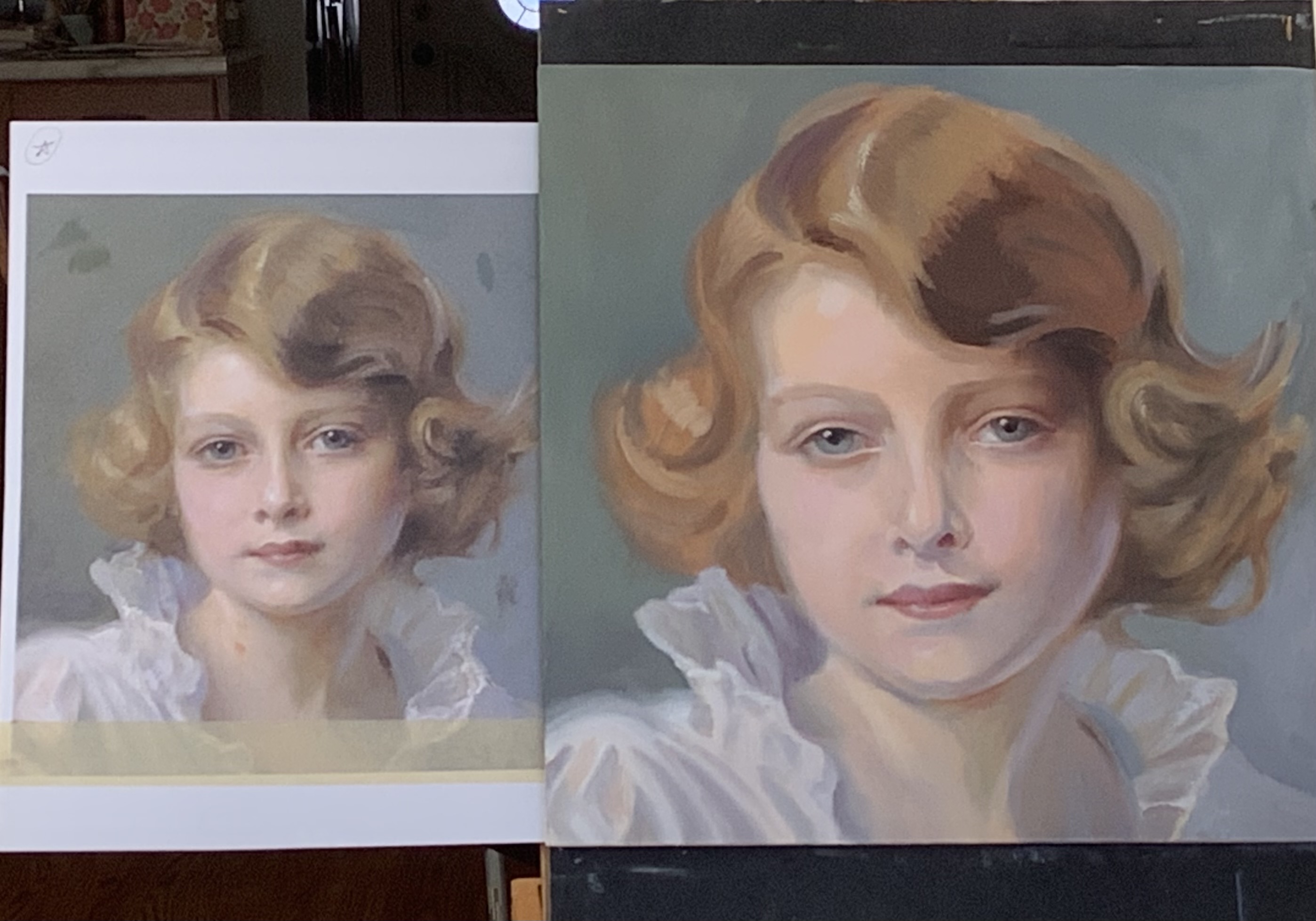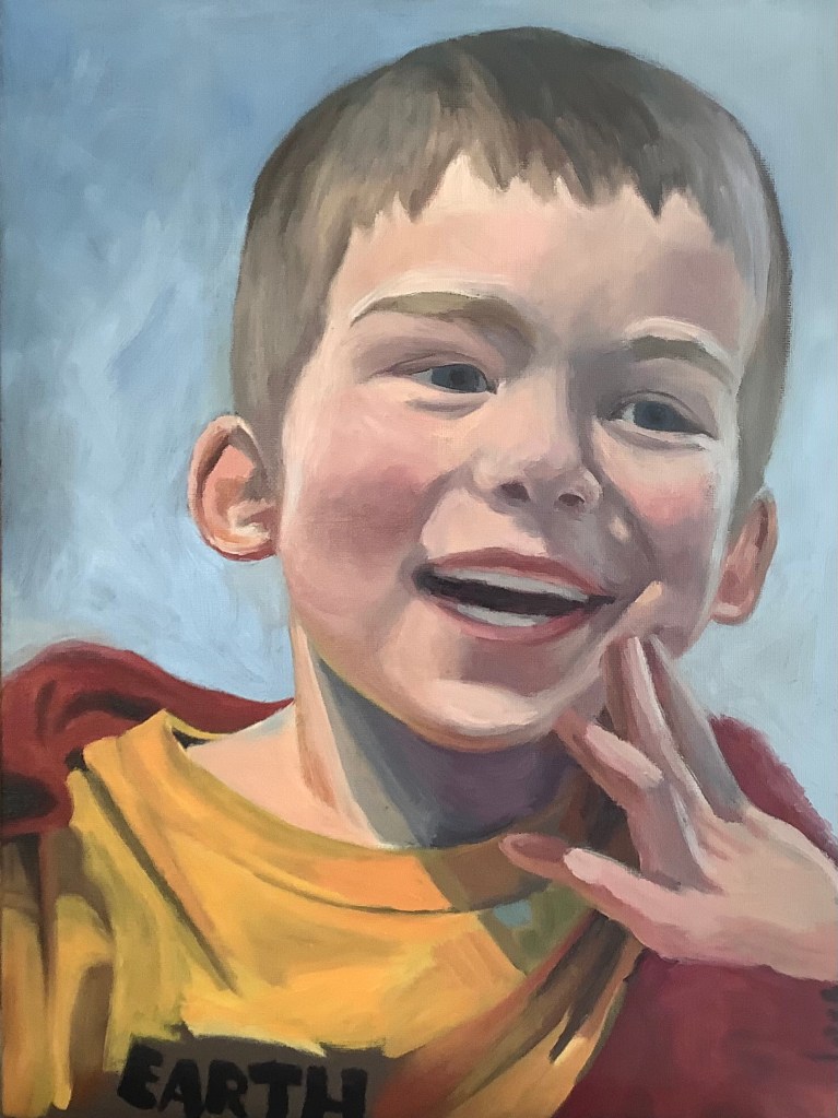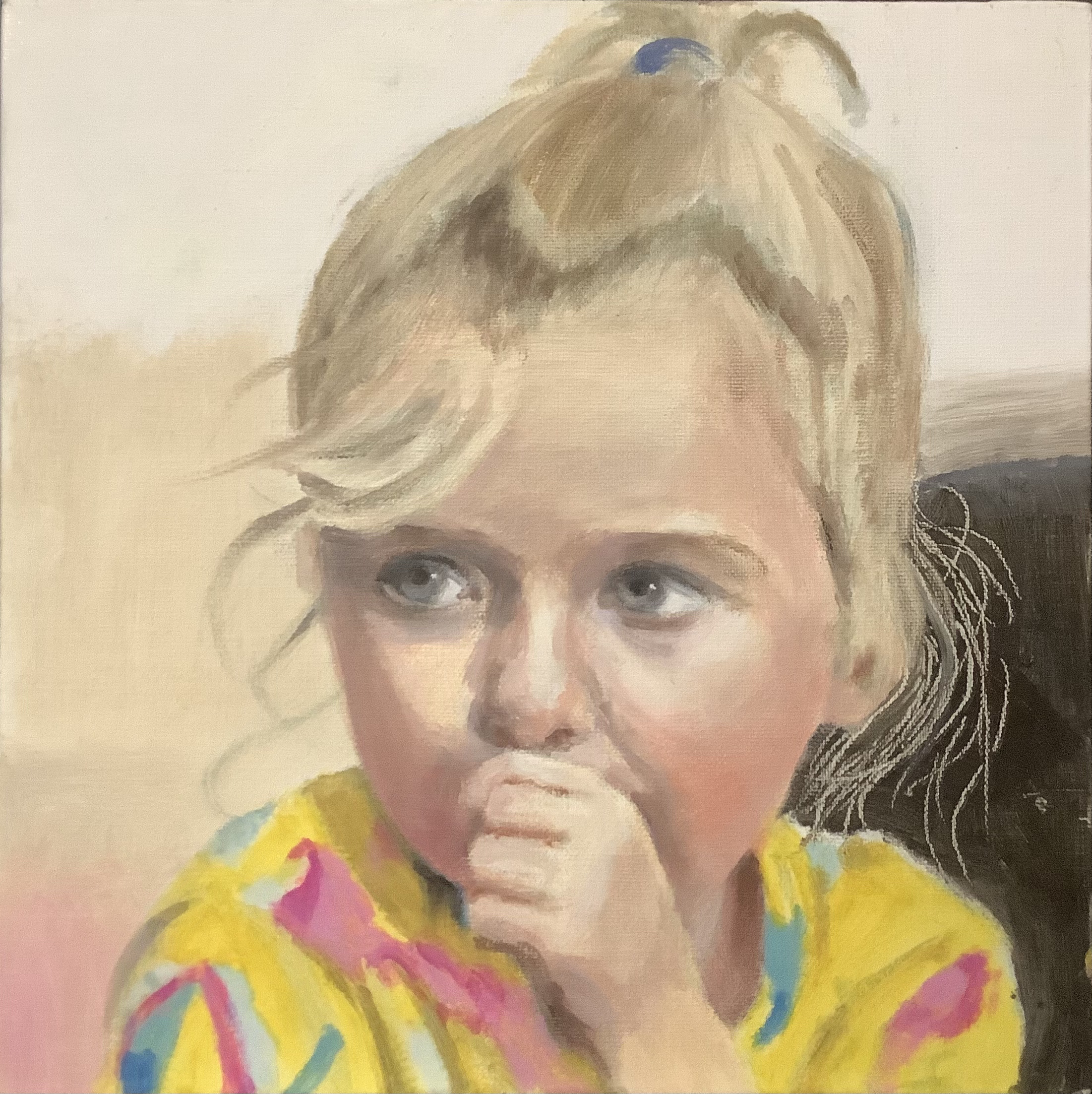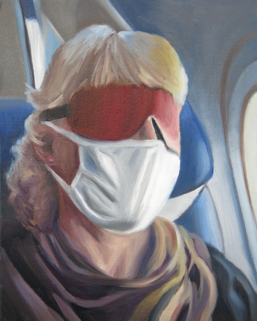 That was exactly how I felt at this moment in the airplane! I sat there with my face almost totally covered, one mask required by the airline, one mask desired by me, and thought, “This is a strange situation we’ve come to in the world”, and was motivated to capture the moment in paint.