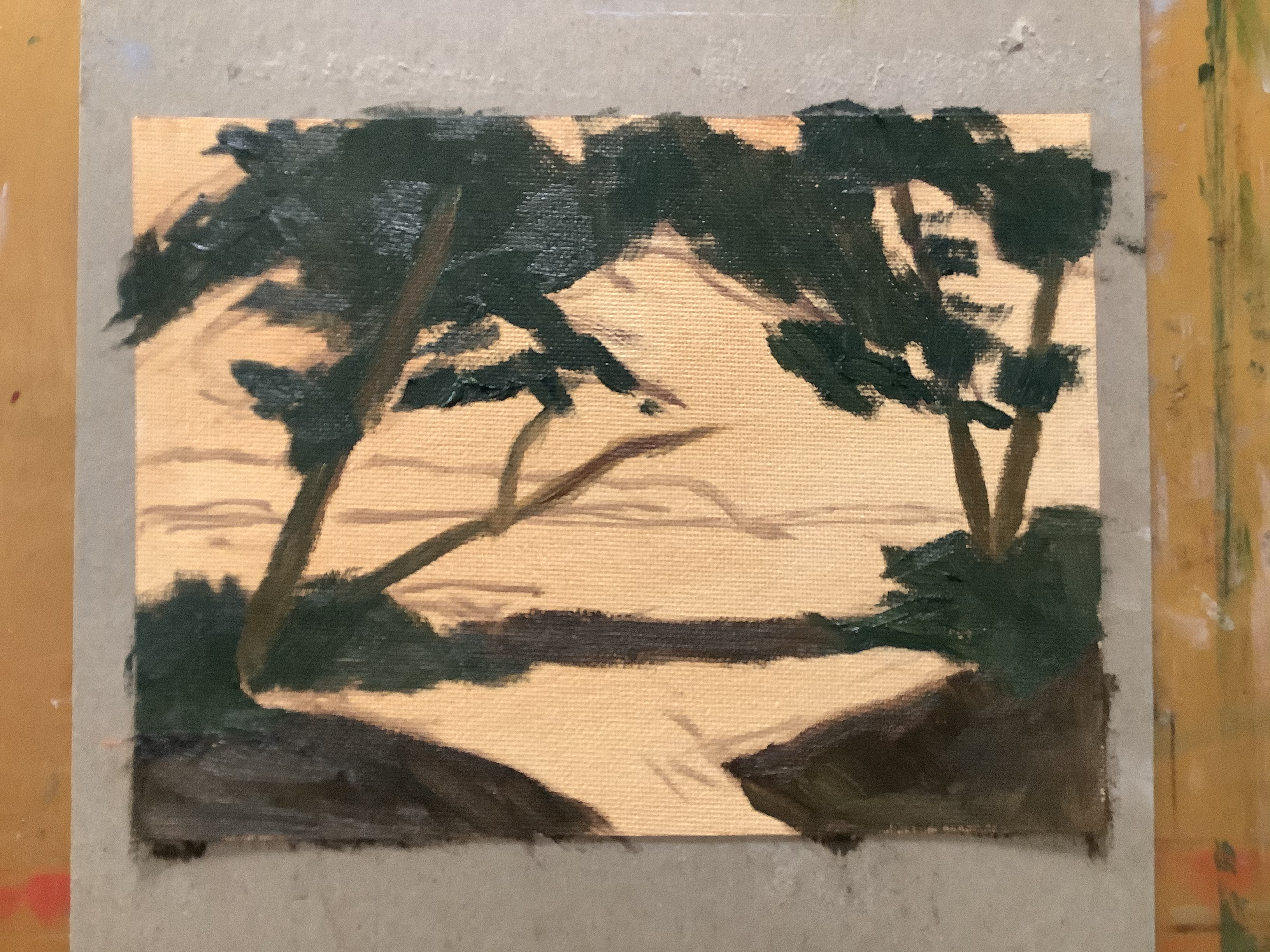 I liked these big trees overshadowing the farmhouse buildings, with the big barn a little closer to me. There were numerous Amish buggies coming and going, and horses being used to plow the fields, so almost the only noise was of horses’ hooves. Altogether a very peaceful three hours of painting.