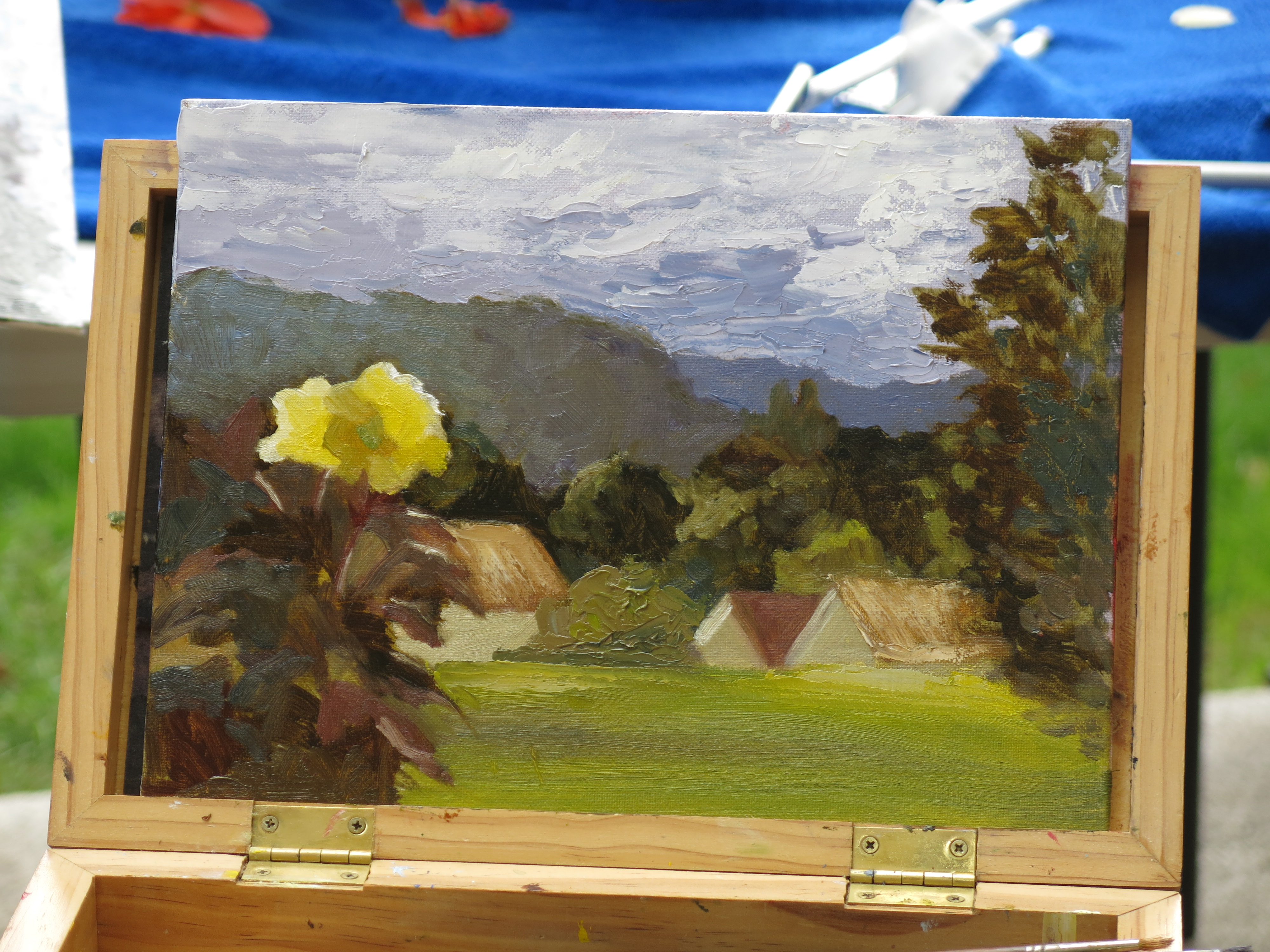 The teacher, Nancy Hawkins , is a kind and gentle lady, who gave useful instruction and good encouragement. On the first lesson I was the only student! We sat on the back patio of the lovely Hoyt Art building for three hours and painted this view to the south. It was exhilarating!