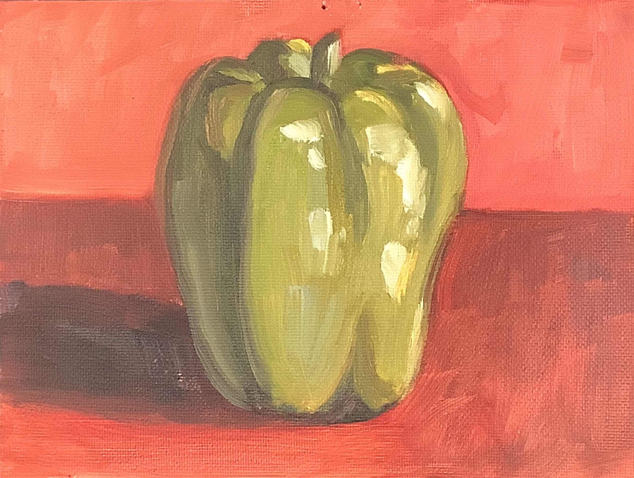 Next I worked on peppers in traditional oils, 6 x 8 inches on canvas paper. The green pepper is from a Patreon lesson by PaintCoach, Chris Fornataro, and the red one is from a still life that I set up myself.