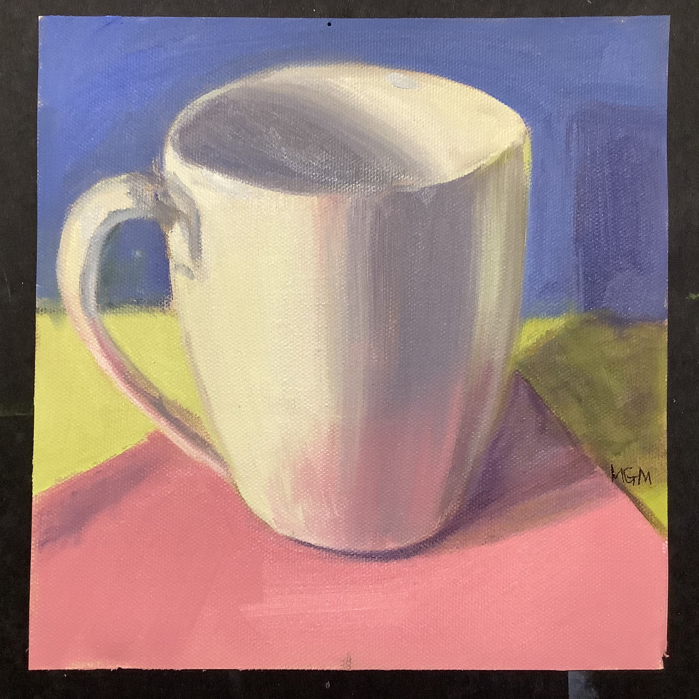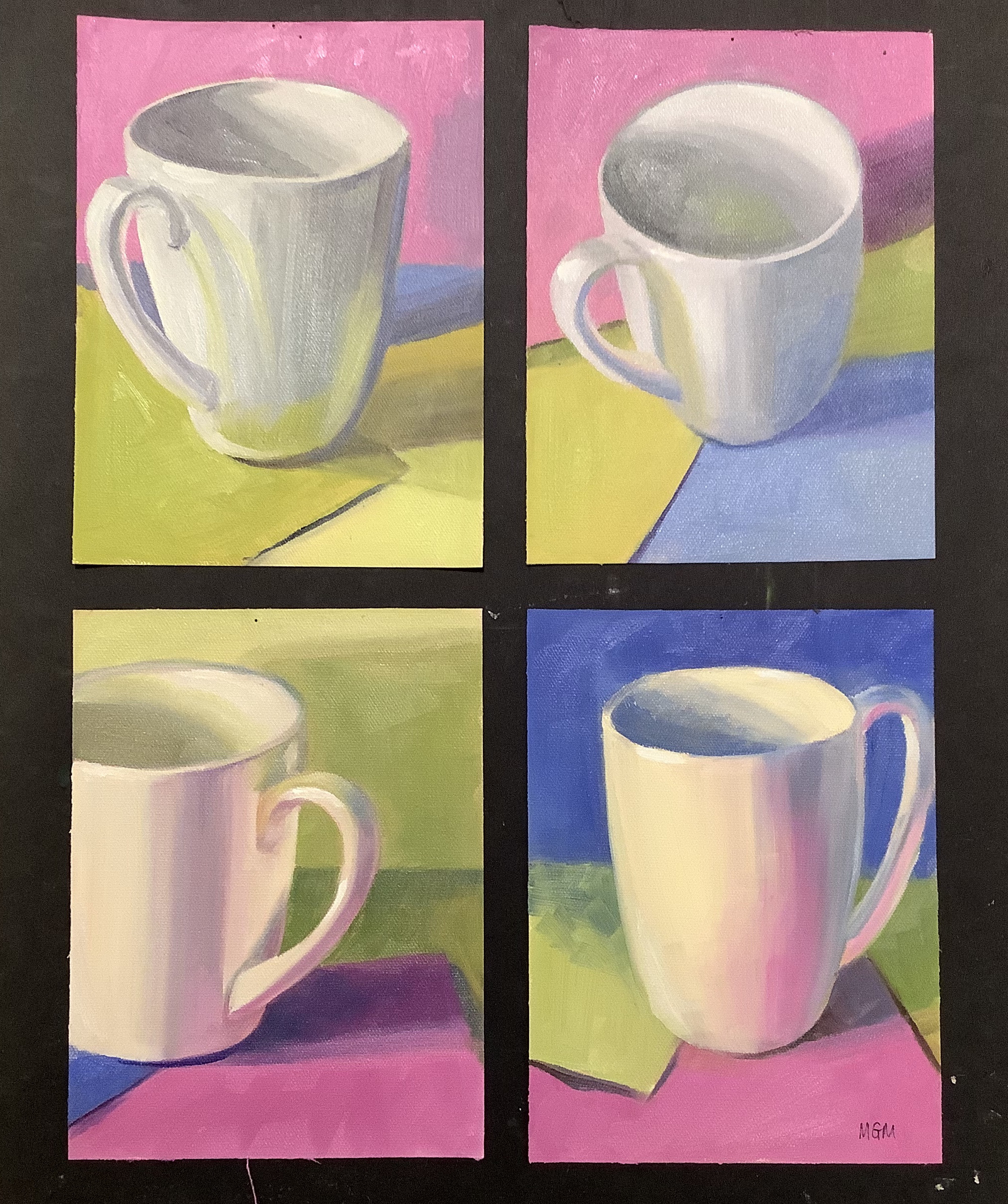 The next still life adventure was a white mug from my pantry and four pieces of colored paper (see the still life set-up below). I followed the guidelines by Carol Marine in her book ‘Daily Painting’ for the set-up and painting the ‘vulnerable’ areas first (the white cup). I loved painting the colors of the paper reflected in the white mug. My favorite is the lower right painting. (They are each 6 x 8 ins).
